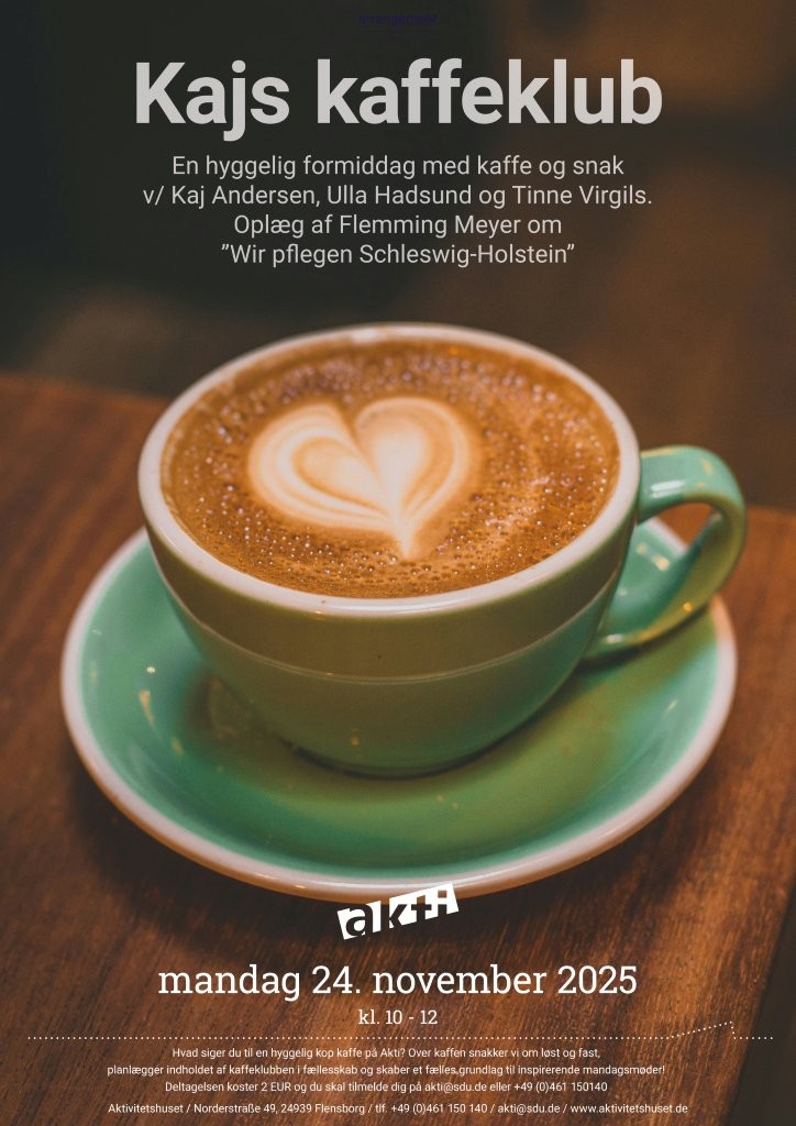 Over kaffen snakker vi om løst og fast, planlægger indholdet af kaffeklubben i fællesskab og skaber et fælles grundlag for inspirerende mandagsmøder! Den 24.11. kl. 10-12 kommer Flemming Meyer på besøg og fortæller om foreningen "Wir pflegen Schleswig-Holstein".