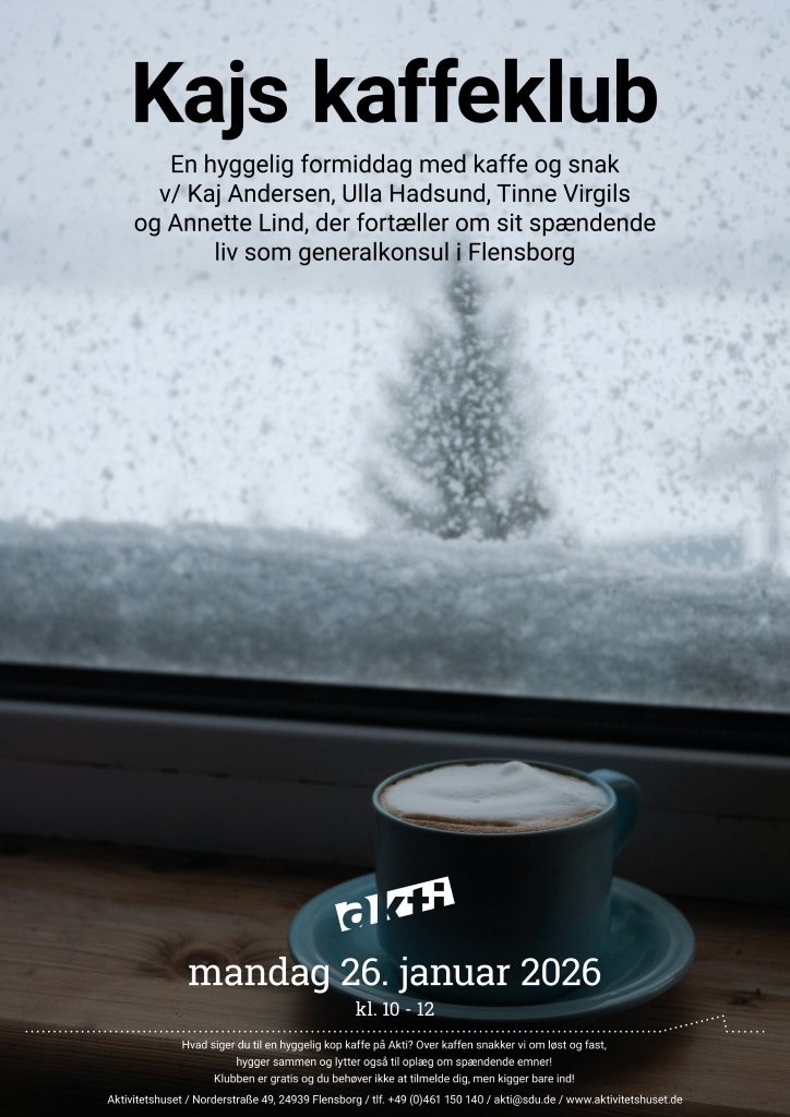 Over kaffen snakker vi om løst og fast, planlægger indholdet af kaffeklubben i fællesskab og skaber et fælles grundlag for inspirerende mandagsmøder! Den 26.1. kommer Annette Lind forbi og fortæller om sit spændende liv som generalkonsul i Flensborg.