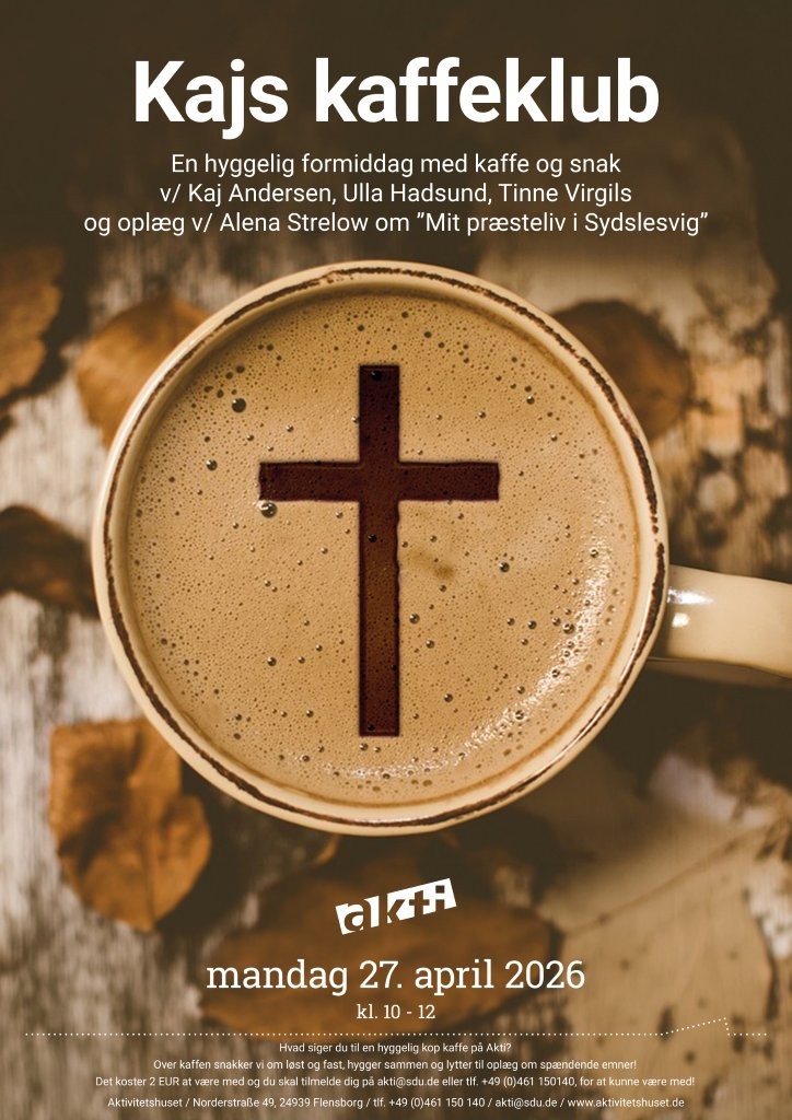 Over kaffen snakker vi om løst og fast, planlægger indholdet af kaffeklubben i fællesskab og skaber et fælles grundlag for inspirerende mandagsmøder! Denne gang kommer Alena Strelow fra Sct. Hans og Adelby danske Menighed på besøg og fortæller om sit præsteliv i Sydslesvig.